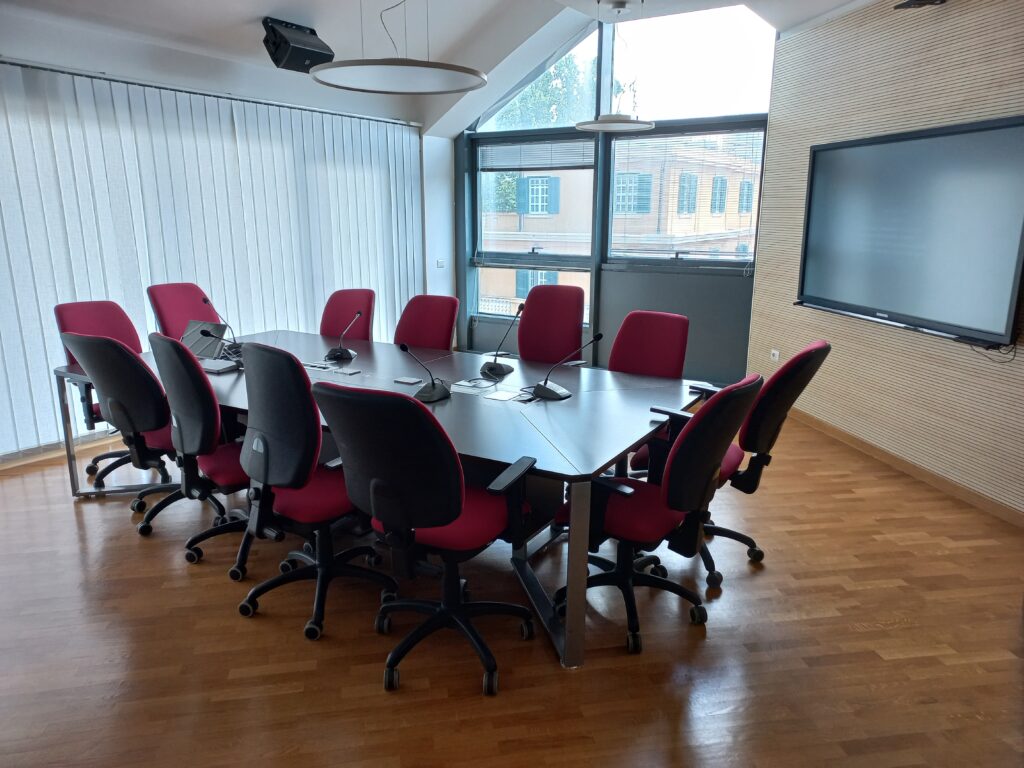 - a modern meeting room, with a “meeting area” equipped with a meeting table that can accommodate up to 15 people, and a “conference area” equipped with a speaker desk, an 80-inch monitor, and armchairs to accommodate up to 40 persons, which will be used for tutorials and meetings.